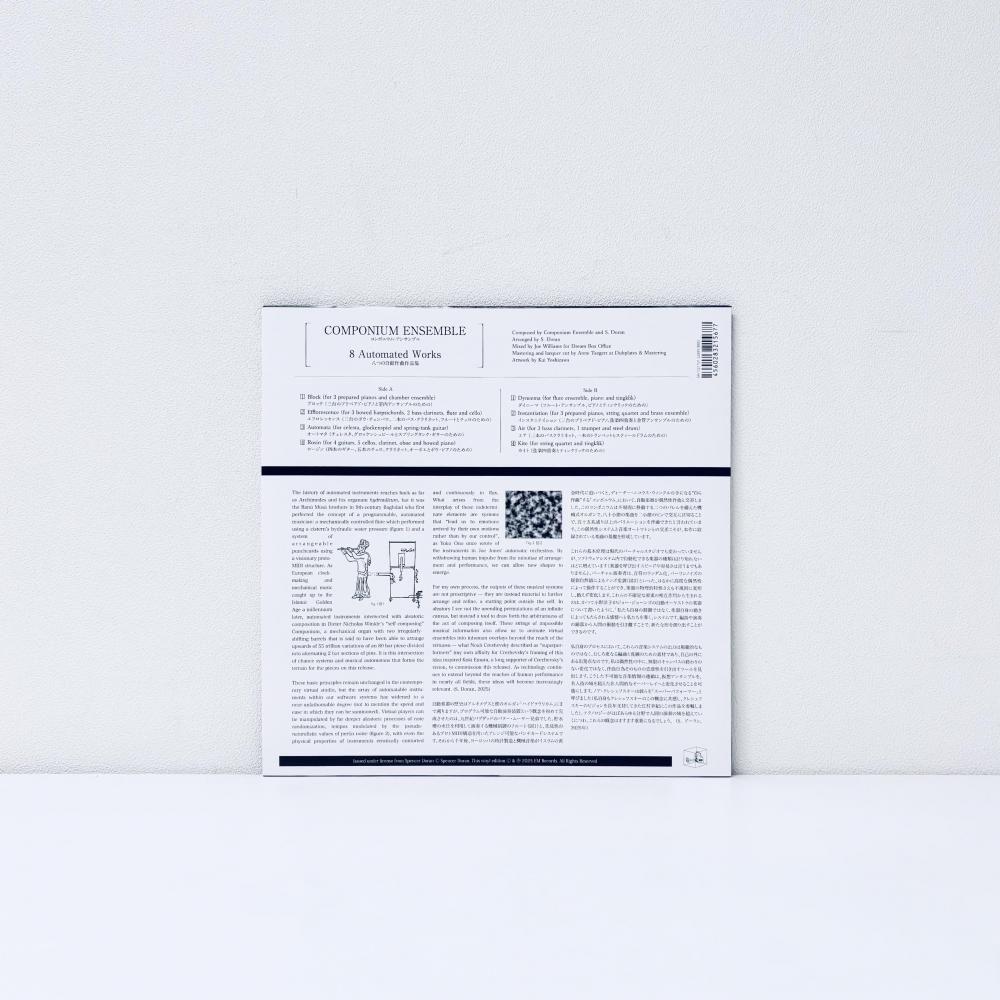 本プロジェクトは、古代ギリシャのアルキメデスに始まり、9世紀バグダッドのバヌー・ムーサー兄弟によって発展した自動演奏楽器の長い歴史から着想を得ています。後者は水圧を利用し機械的に制御されたフルートと先見性のあるプロトMIDI構造を持つパンチカード機構という、プログラム可能な自動演奏のコンセプトを初めて完成させていますが、この機械的な音楽制作は、千年後、筐体それ自体で自動作曲できる「コンポニウム」という機械音楽システムを発明したディートリッヒ・ニコラス・ウィンケルによって偶然性の原理を用いて拡張されました。ドーランは《コンポニウム・アンサンブル》でこの系譜をさらに発展させ、デジタル技術で膨大な数の仮想楽器を自動化し不確定性の要素を導入する機能を活用することで、人間の衝動や恣意の限界を超えた仮想演奏者という「新たな形態の出現」に扉を開いています。この「サイバーヒューマン音楽」ともいえる形態の先駆者であるノア・クレシェフスキーに捧げられた『八つの自動作曲作品集』は、プリペアドピアノ、ハープシコード、チェレスタ、バスクラリネット、フルート、チェロ、バリ島のティンクリックなど、多岐にわたる楽器を複数の仮想アンサンブルで演奏しています。この一見難解にみえる理論的基盤にもかかわらず、その音楽は聴きやすくかつ魅力的で、想像を超える広がりと新鮮さを持っています。軽やかなタッチと洗練された旋律感覚は、ポップスファンとクラシック/コンテンポラリー音楽のリスナーの両方に響くことでしょう。ミキシングはドーランの長年のコラボレーターであるジョー・ウィリアムズ(Motion Graphics/Lifted)が担当。音楽を視覚面から解説するハイパーリアリスティック・アートは日本のビジュアルアーティスト/グラフィックデザイナー、吉澤風生(Kai Yoshizawa)によるものです。10インチ・レコード/CD/デジタルのリリースで、CDエディションとフル・デジタル版にはカール・ストーンによるリミックスがボーナストラックとして収録されます。
