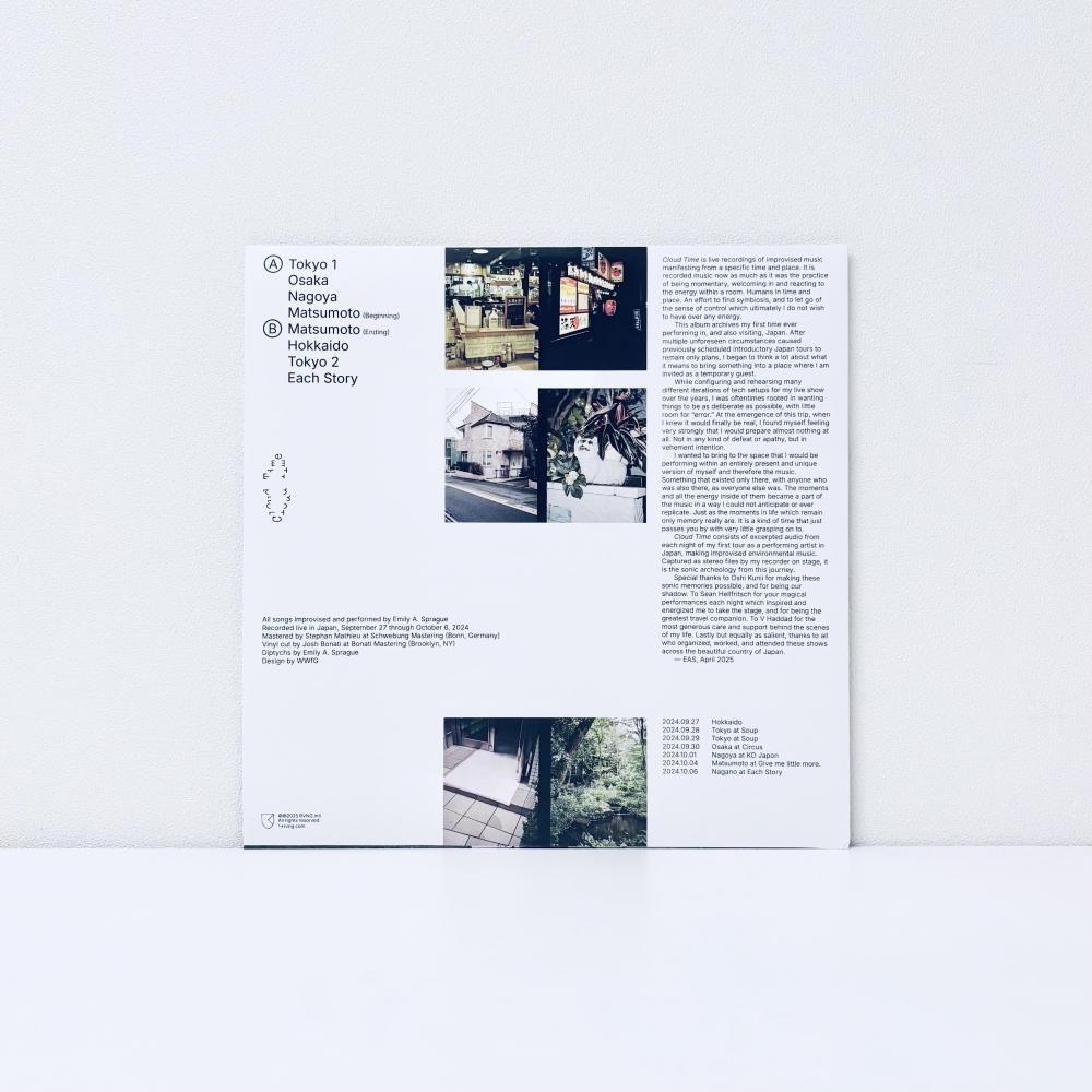 Emily A. Sprague の最新作は、昨年2024年に初来日ツアーで録音された、特定の時間と場所から生まれた即興演奏を記録を元に制作された、美しいアンビエント作品。本作は、それぞれの場所で彼女が感じ取った空気感とその瞬間に流れる時間との対話を通して、生まれたその瞬間に存在する音楽が収録されています。環境そのものと呼吸を合わせながら、その場に居合わせた人々や時空間の境界を溶け合わせ、曖昧な雲のように形を変えながら、透明な余白の中に漂う音色。雲の中で優しく光るようなシンセの音色、その場の音の響きが残響として美しく響き、音楽が「出来事」として立ち上がる瞬間を、聴き手の時間に重ね合わせるような、深い静けさと開かれた感覚へと誘います。NYC【Rvng Intl.】 からのリリース。[GRRRDEN]